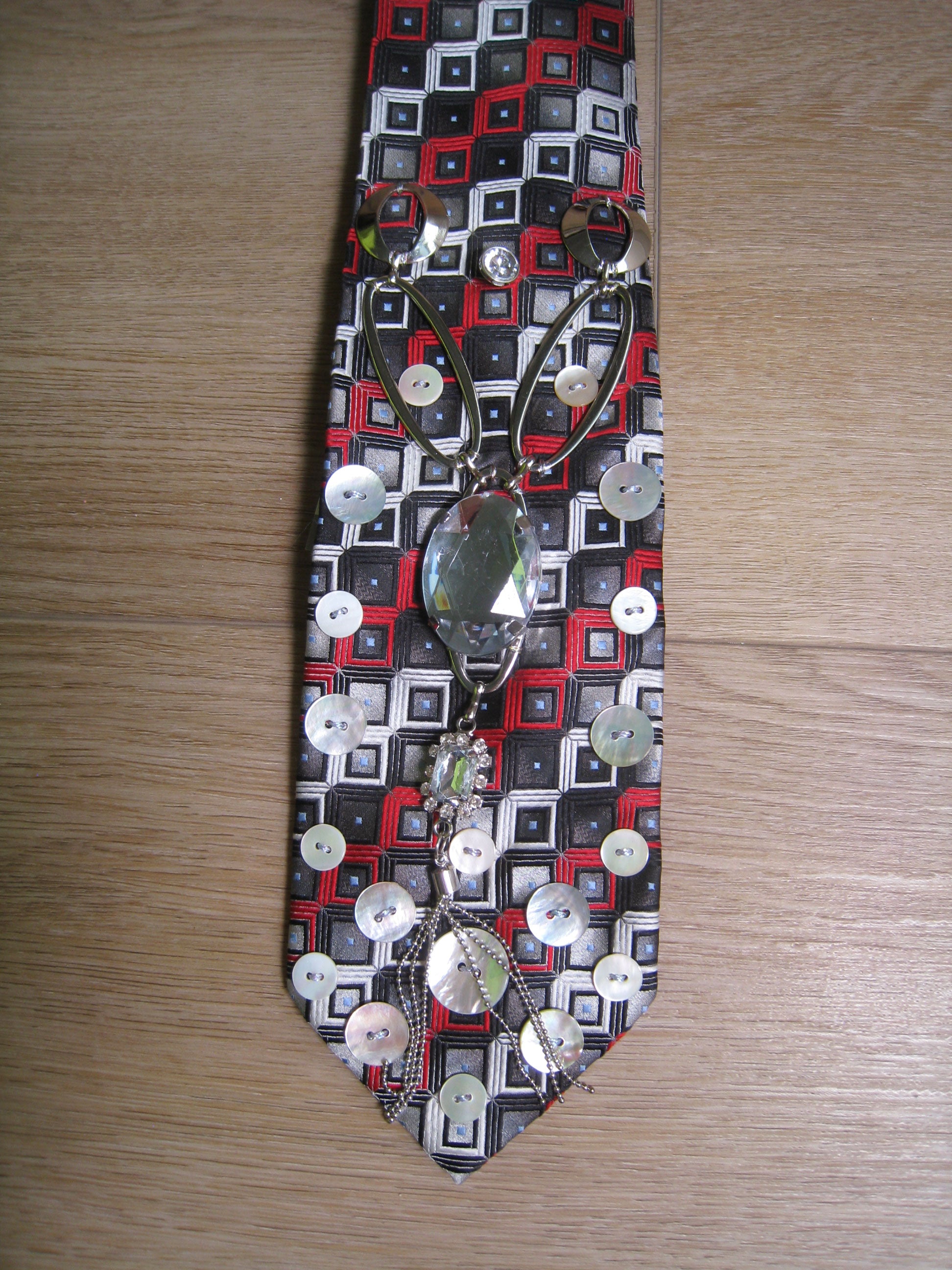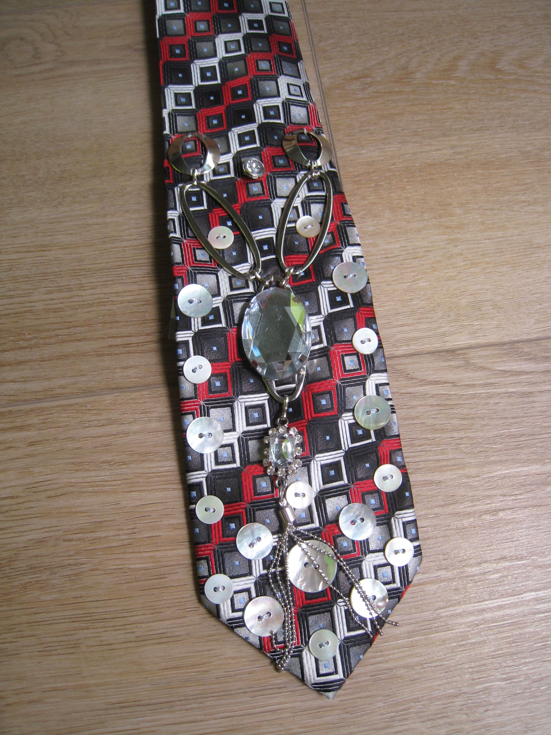 one of a kind upcycled vintage tie featuring hand embellished buttons and rhinestone chain.