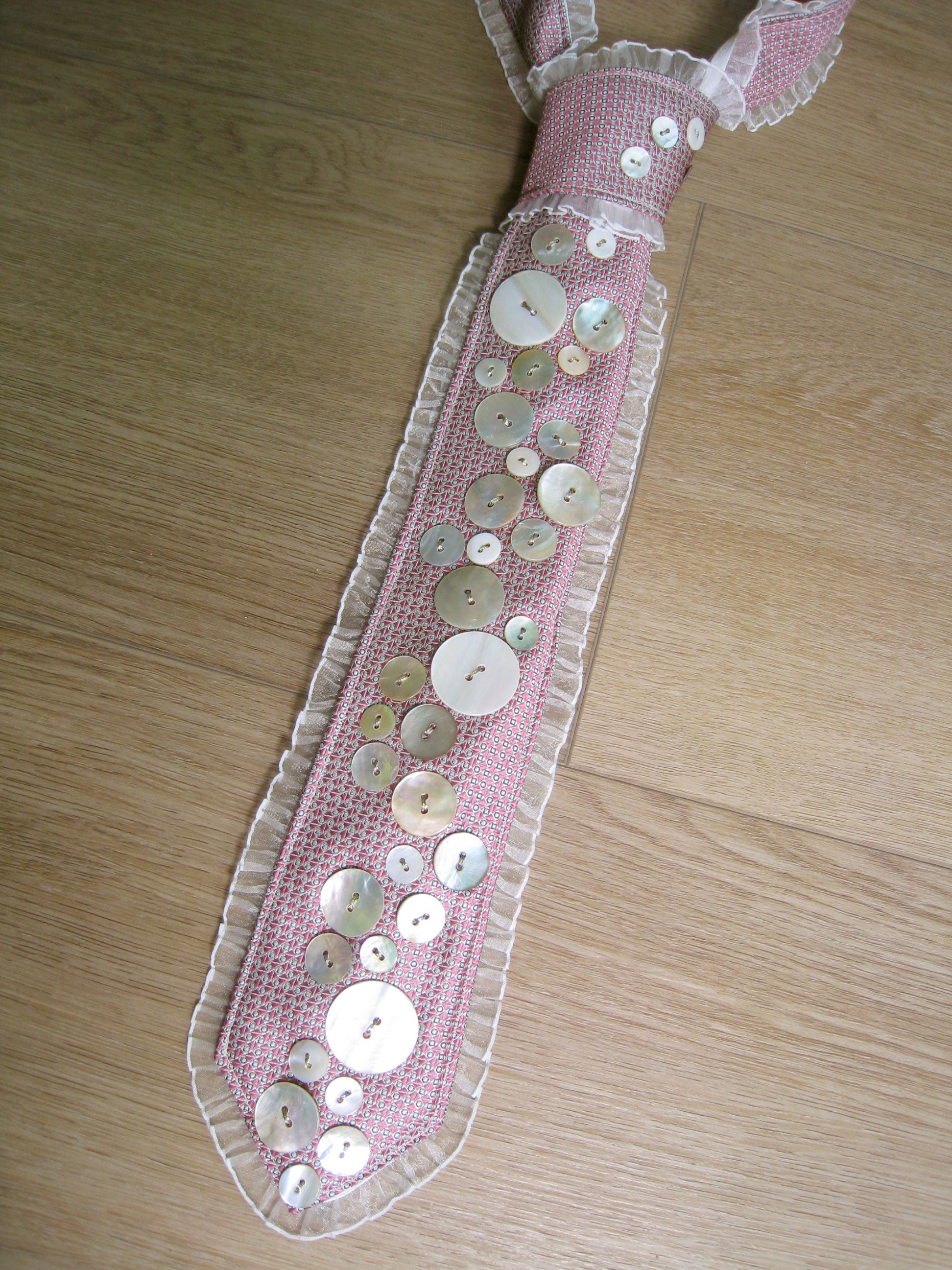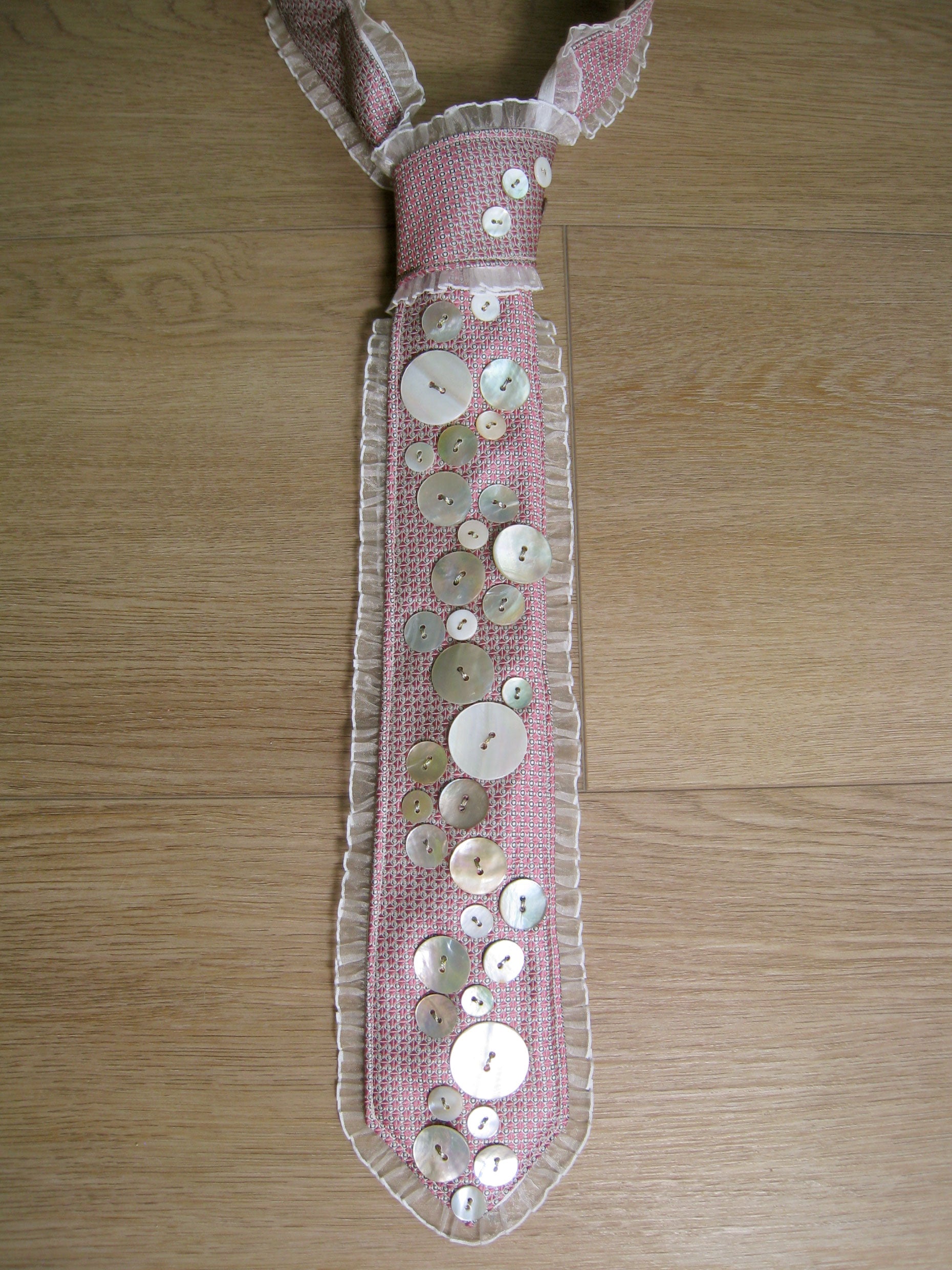 one of a kind upcycled vintage tie featuring hand embellished buttons and white ruffle trim.