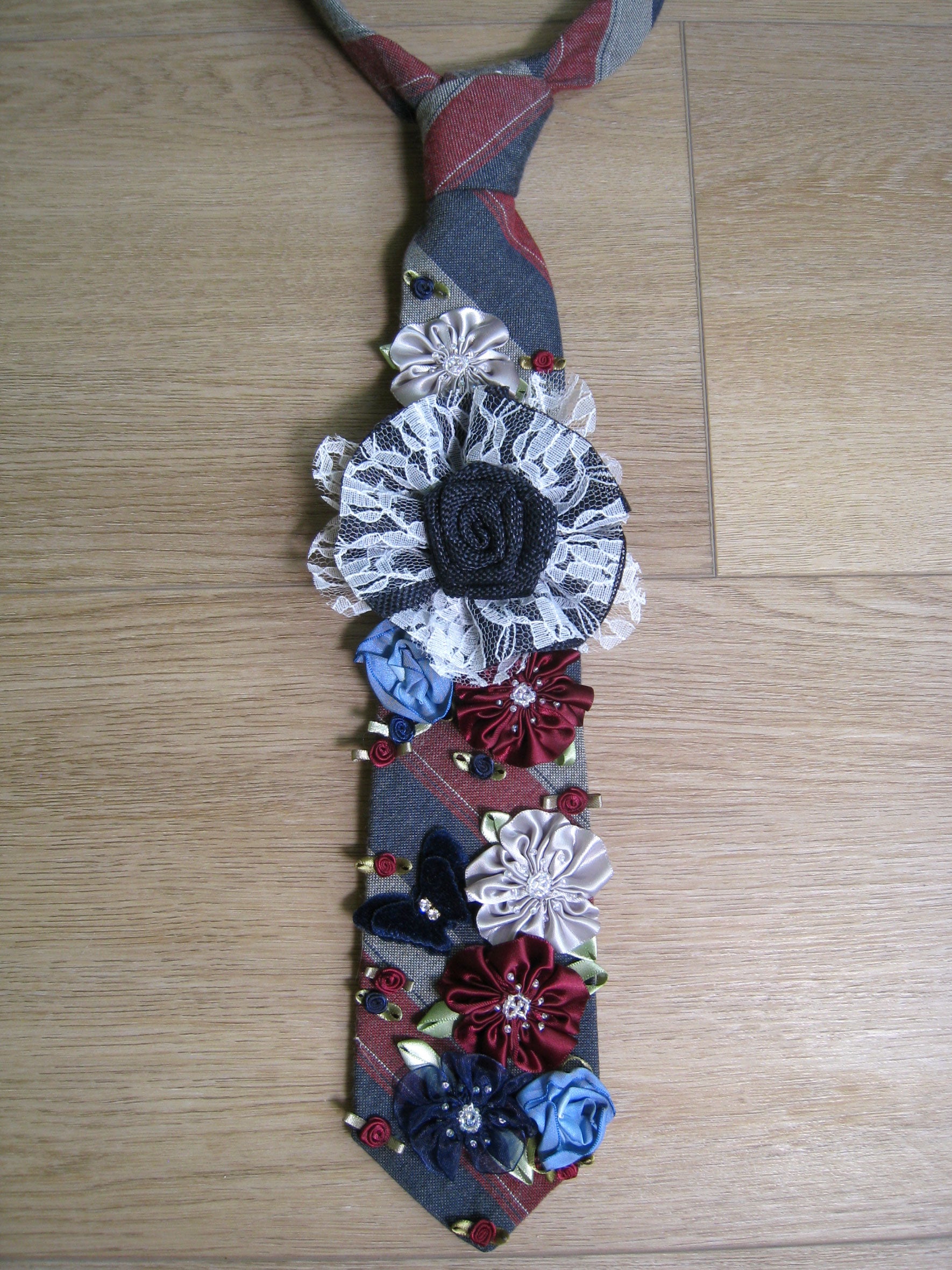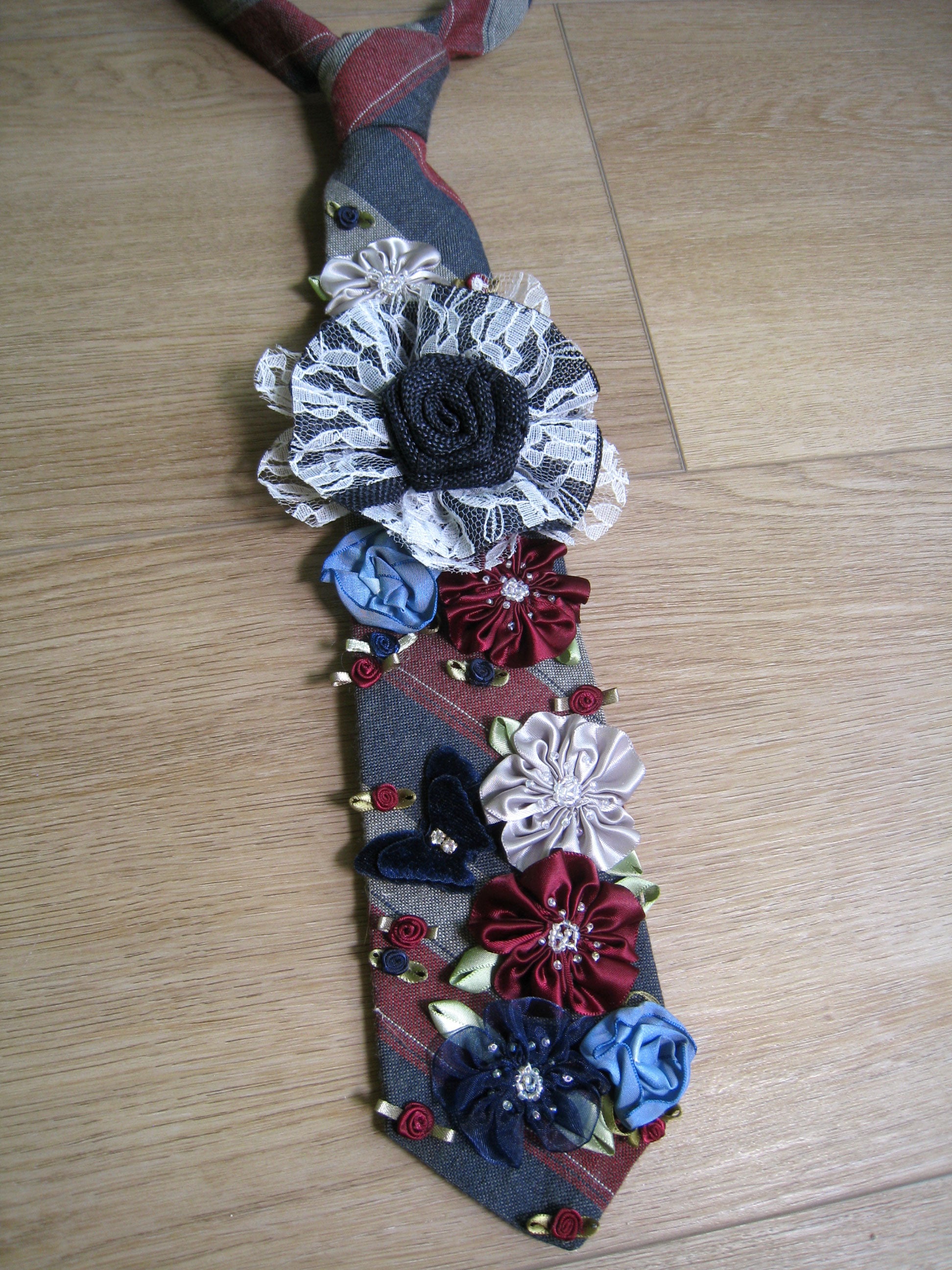 one of a kind upcycled vintage tie featuring hand embellished fabric flowers.