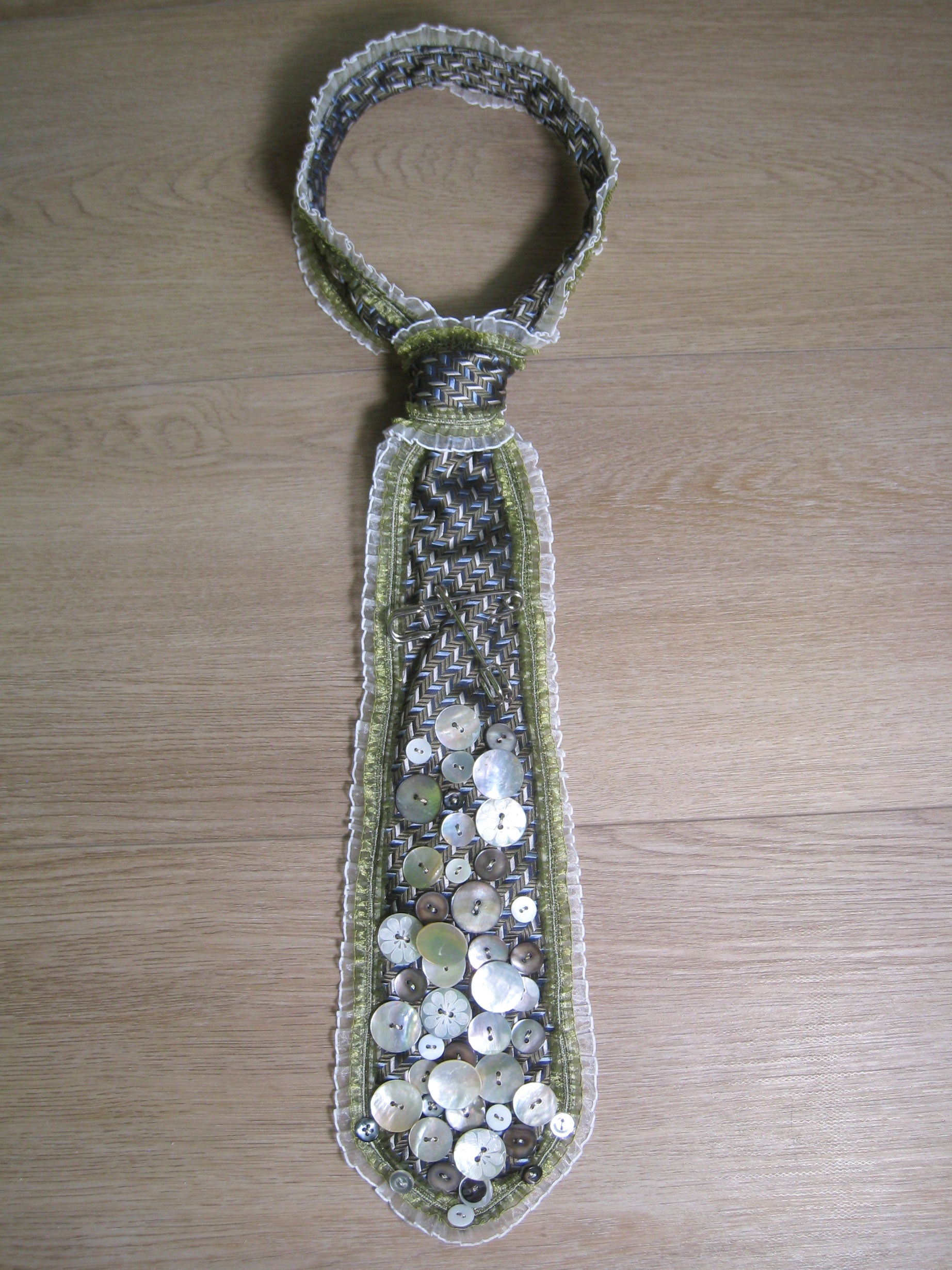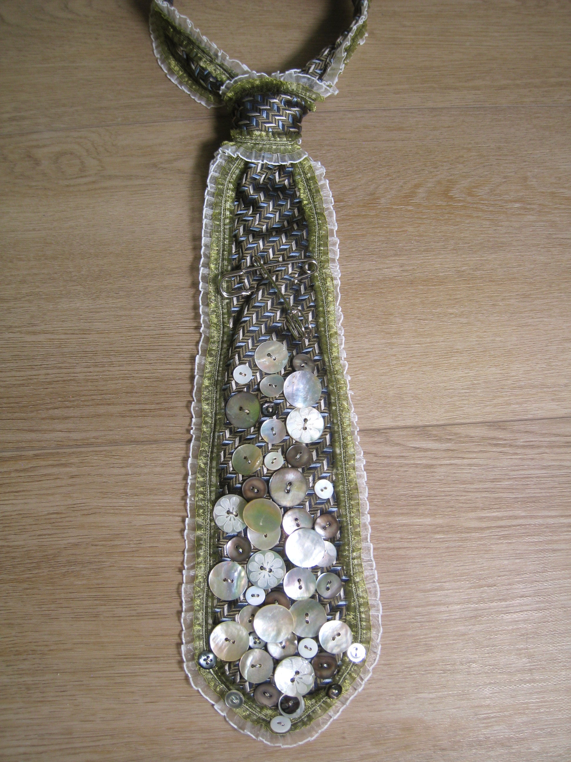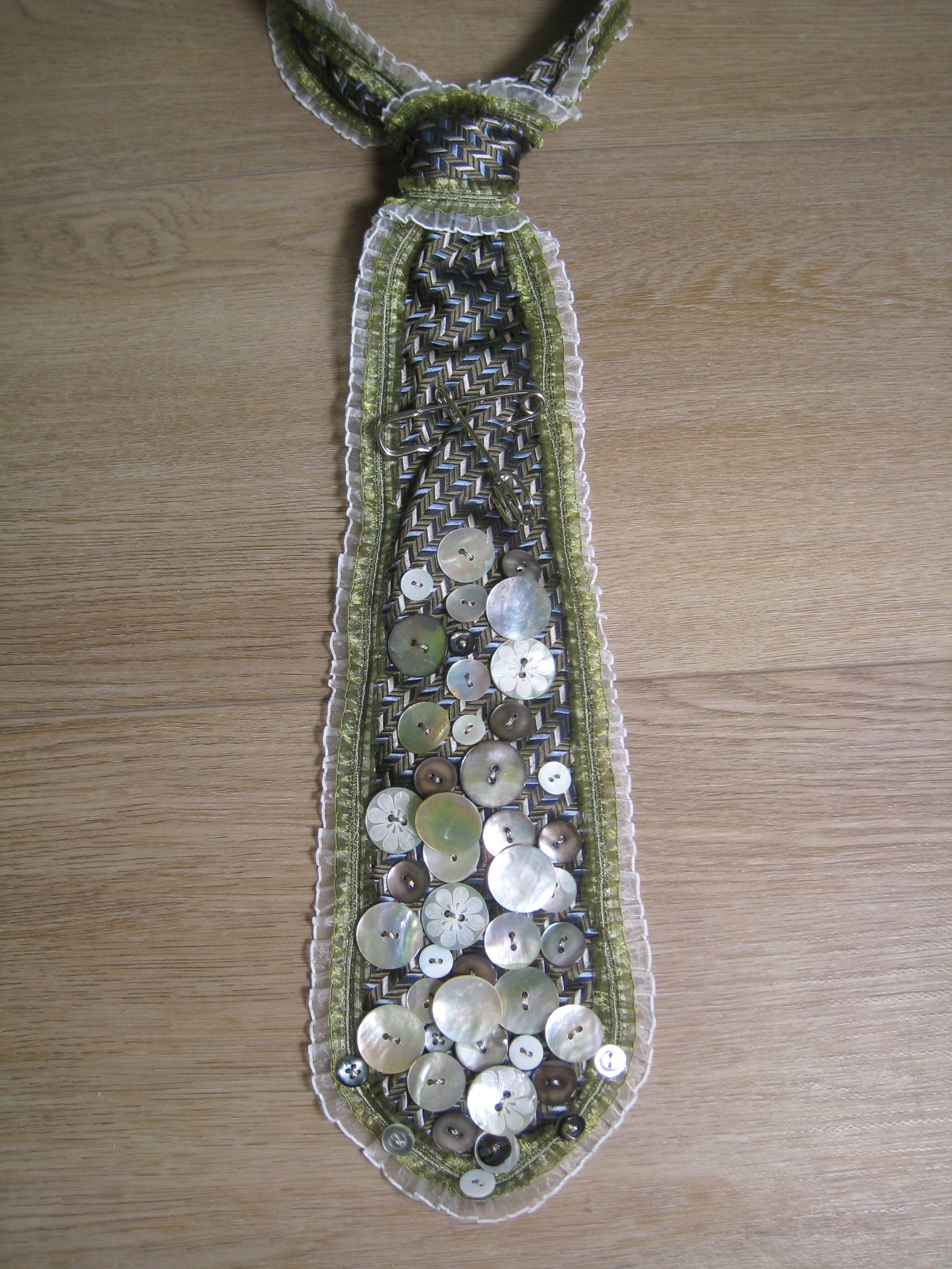 one of a kind upcycled vintage tie featuring hand embellished buttons with green and white ruffle trim.