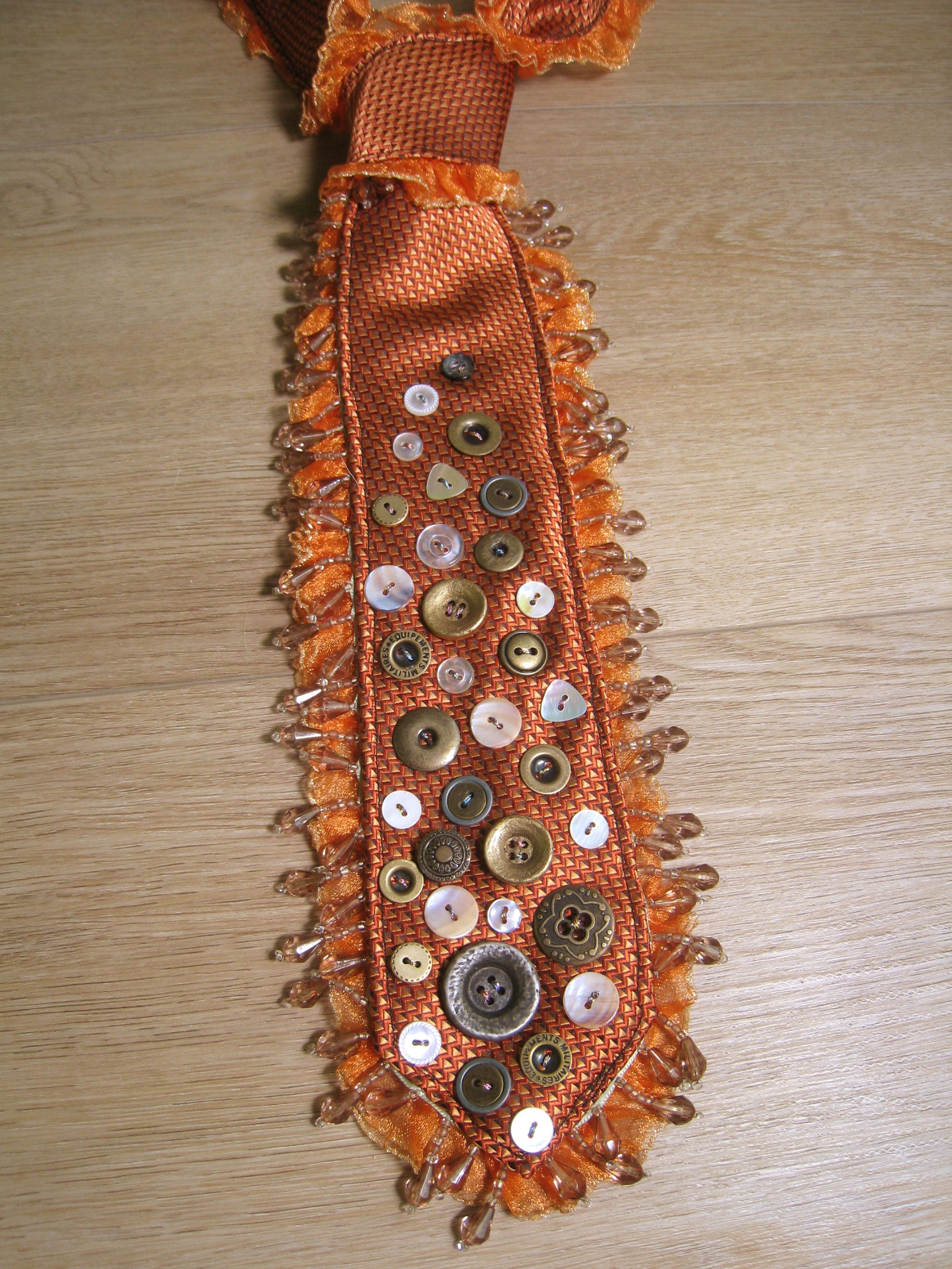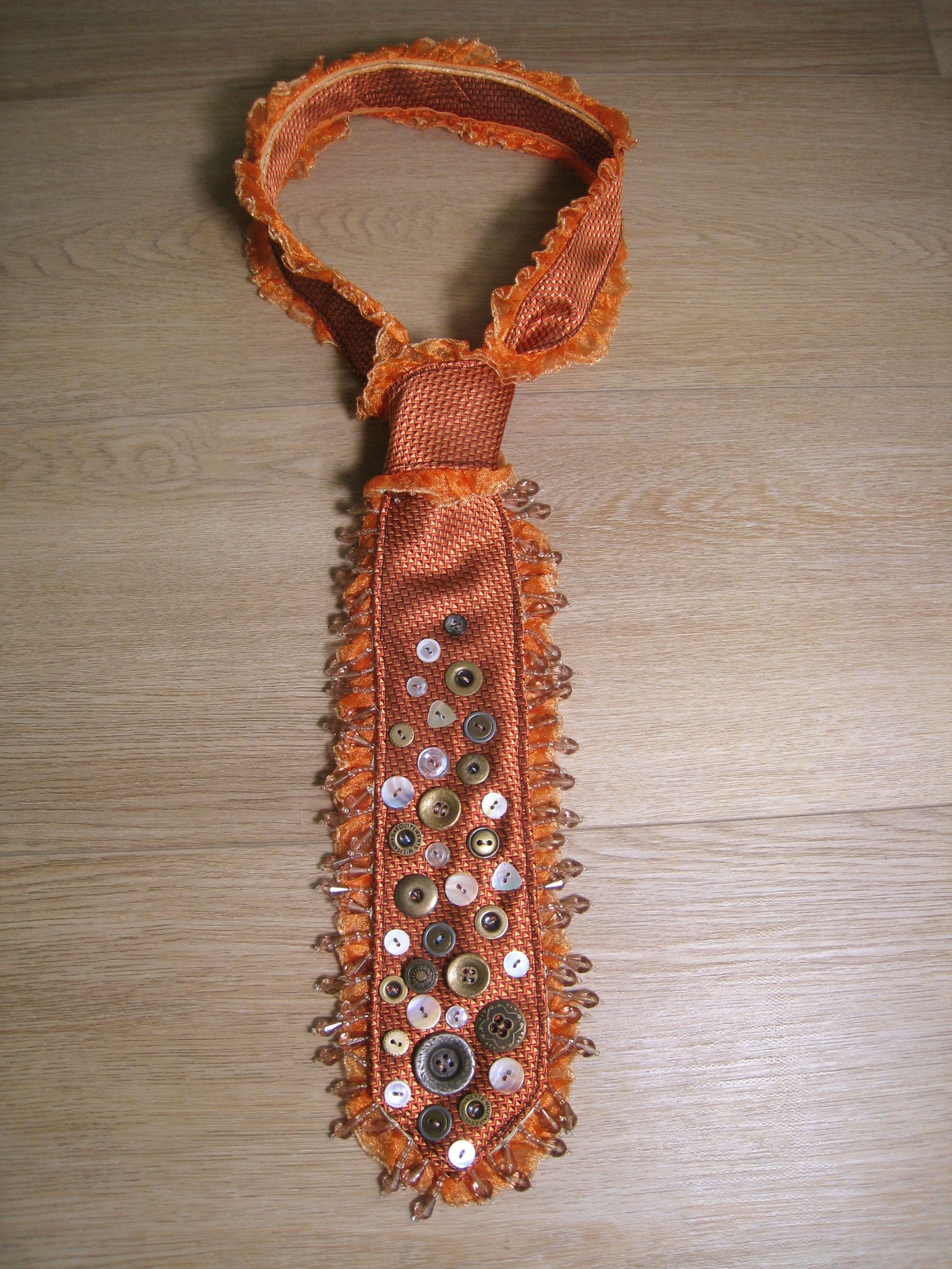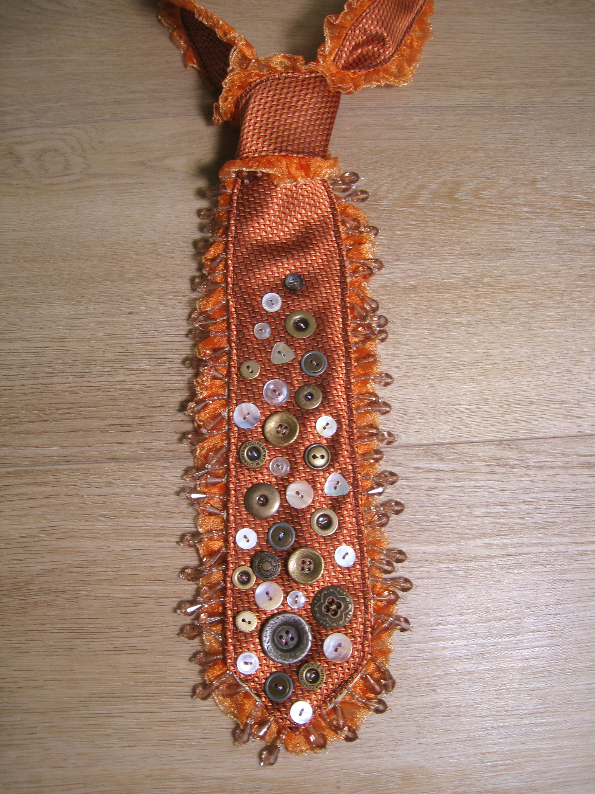 one of a kind upcycled vintage tie featuring hand embellished buttons with ruffle and beaded trims.