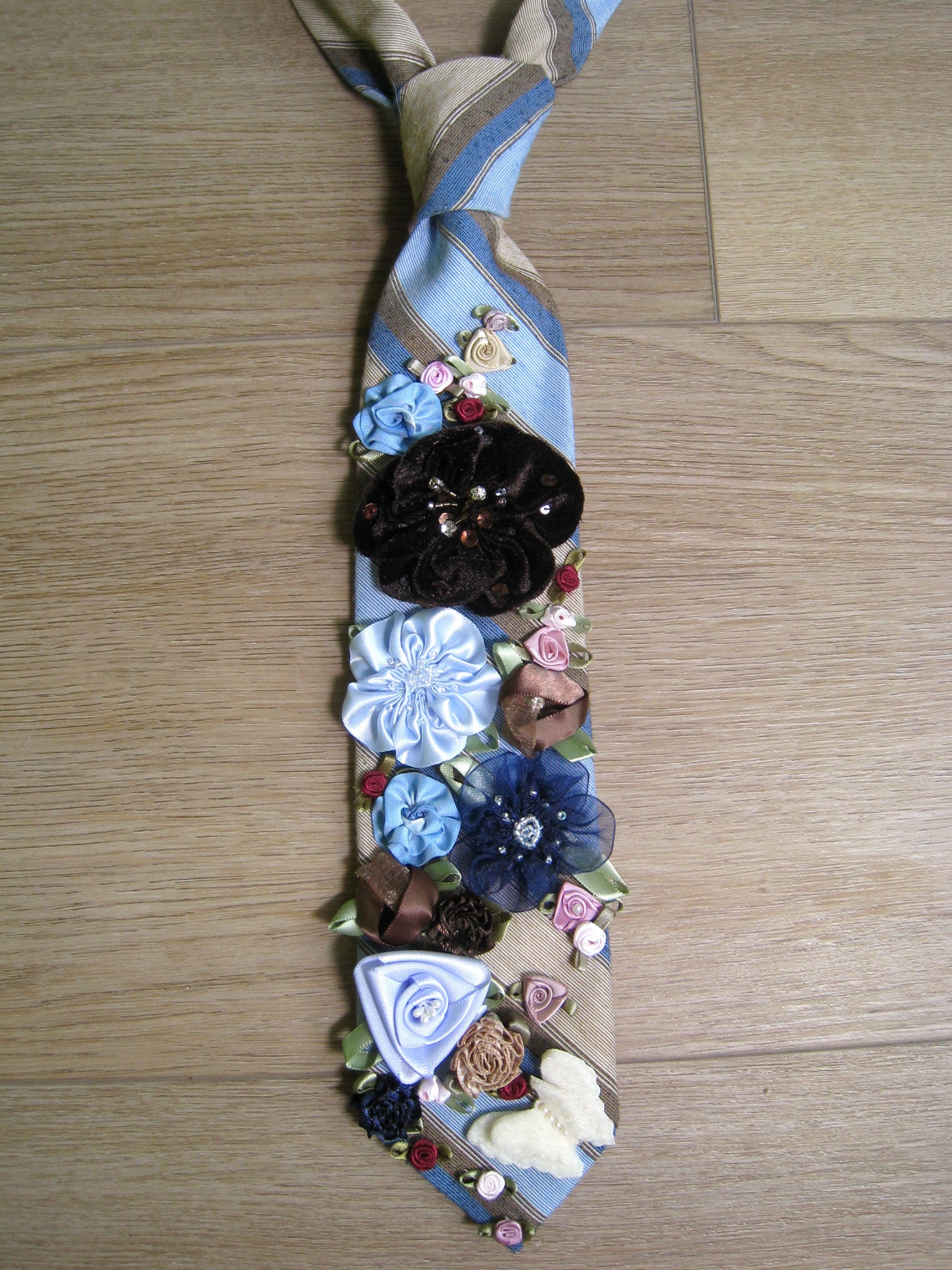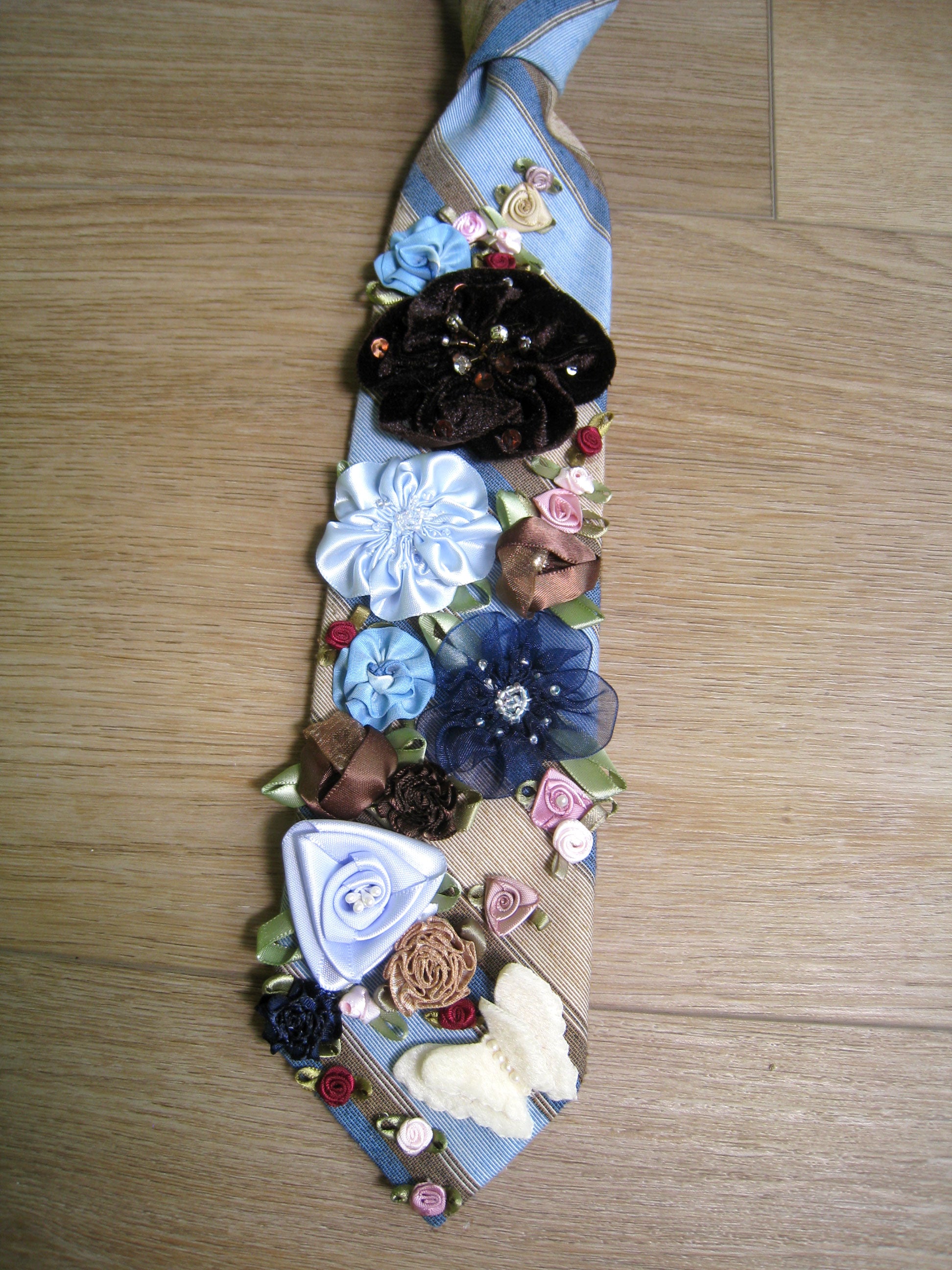 one of a kind upcycled vintage tie featuring hand embellished fabric flowers.