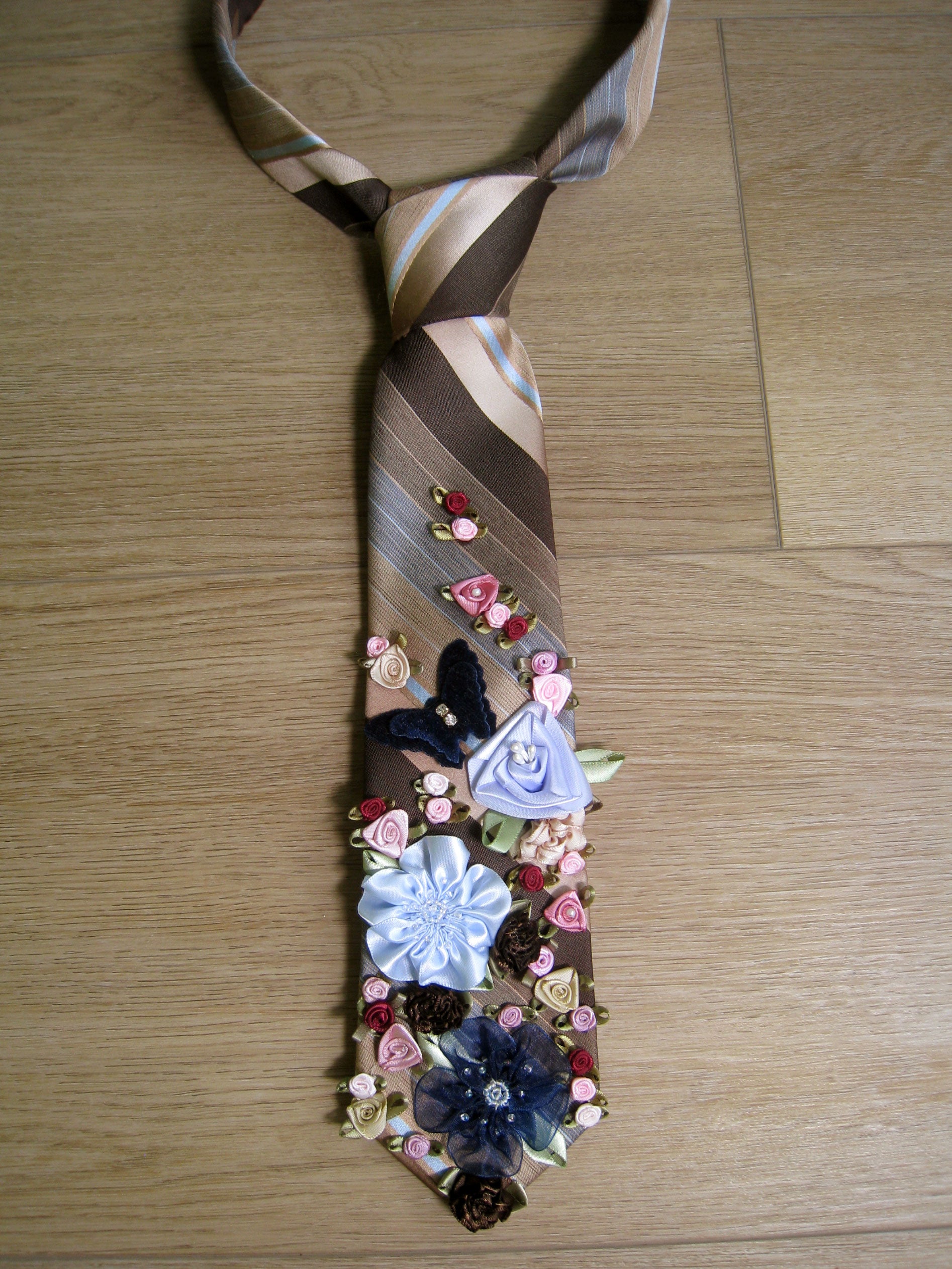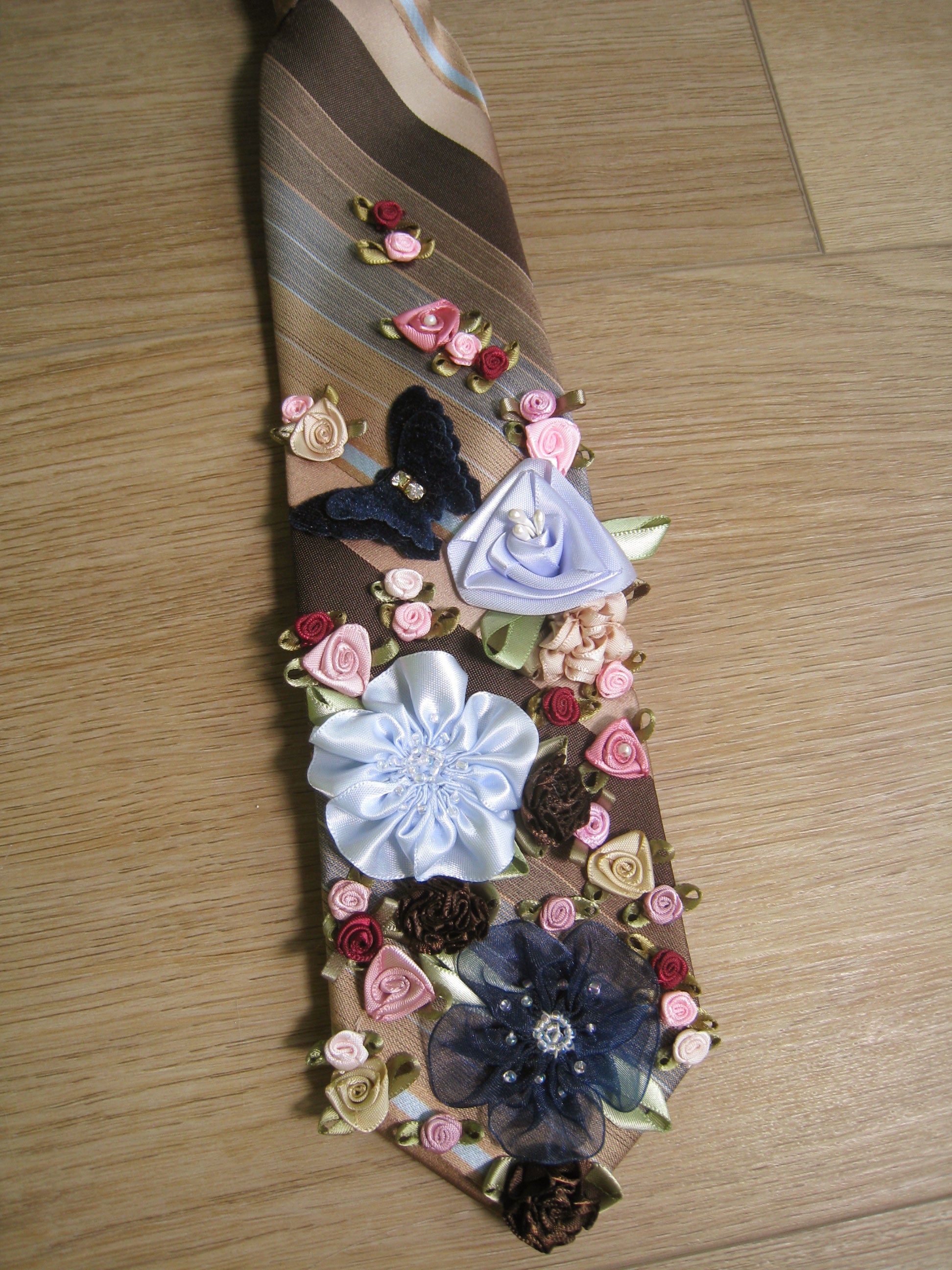 one of a kind upcycled vintage tie featuring hand embellished fabric flowers.