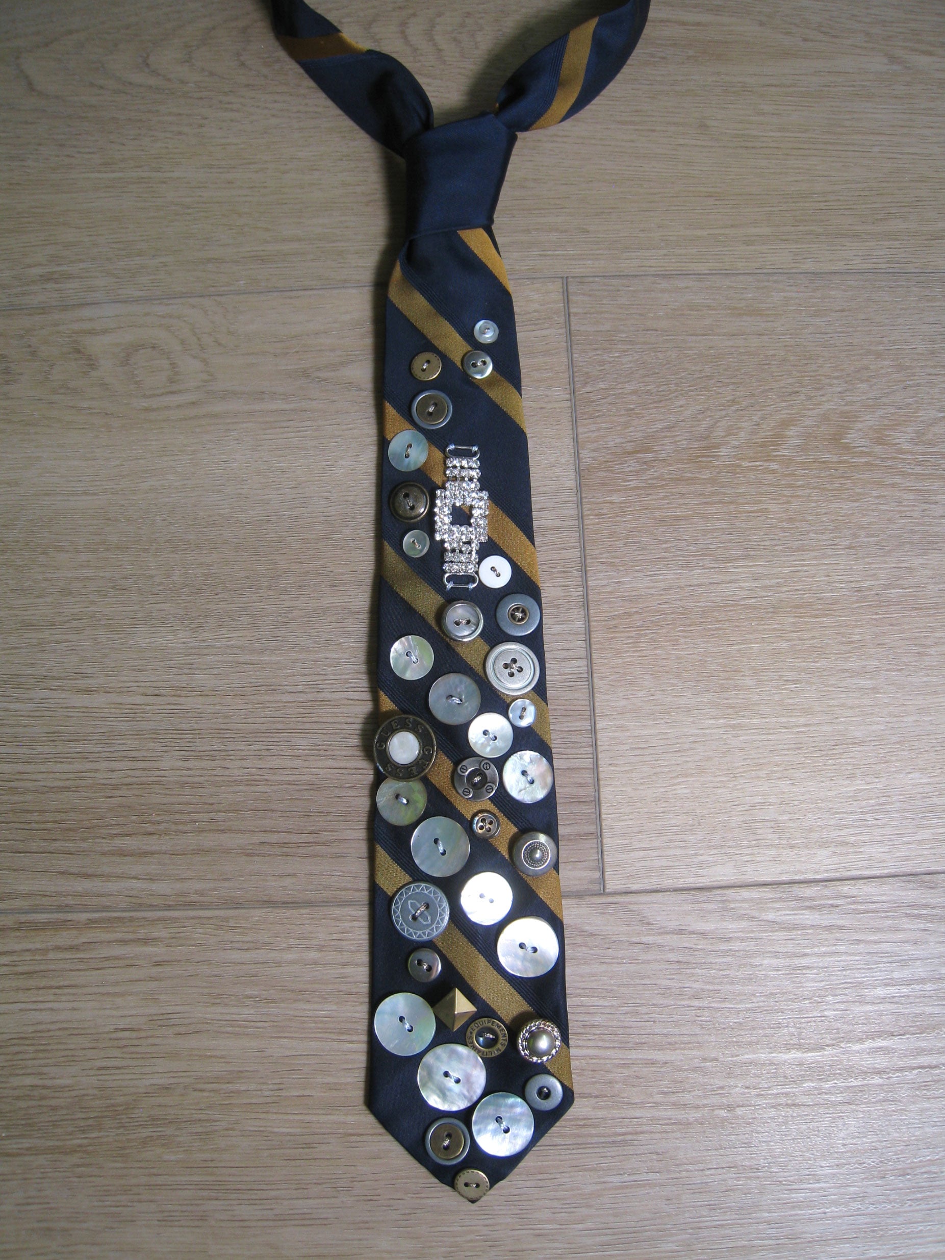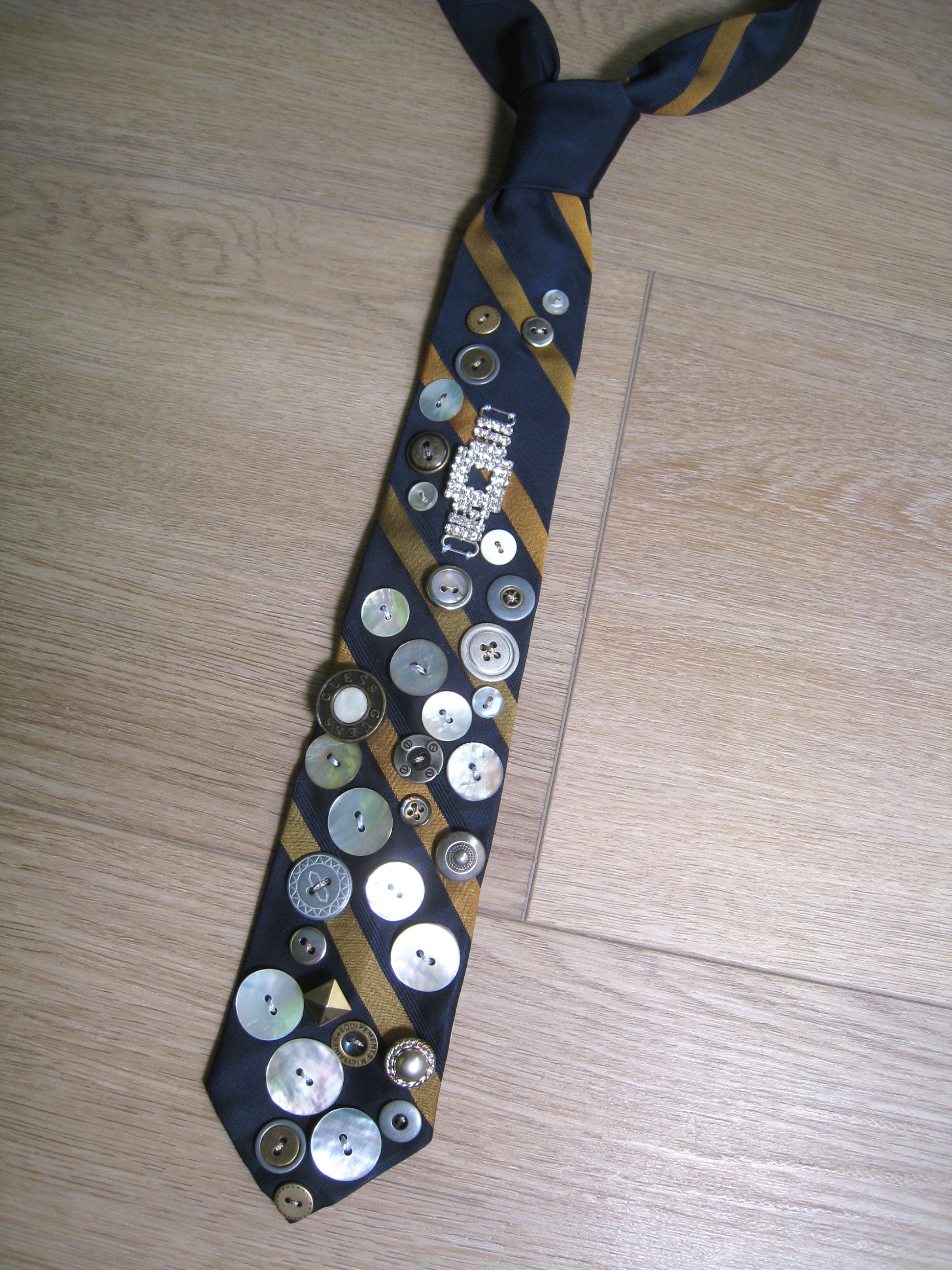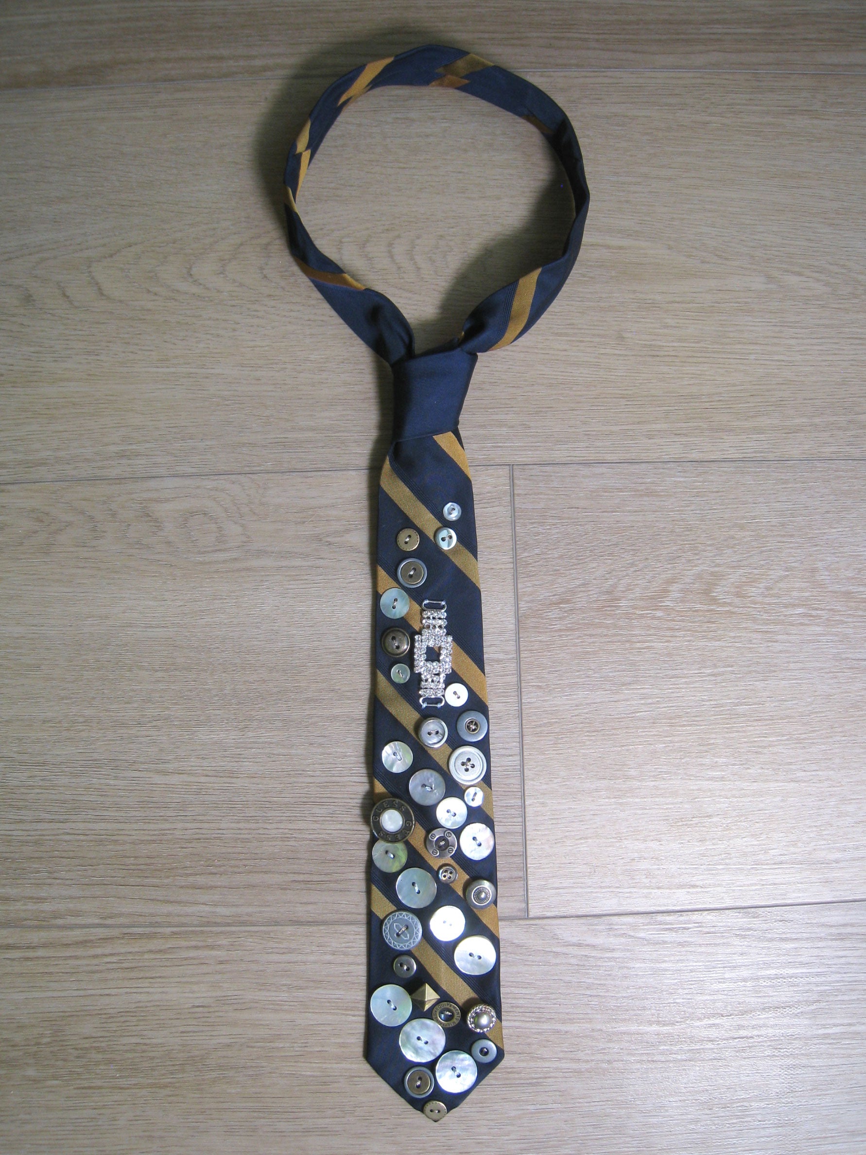 one of a kind upcycled vintage tie featuring hand embellished buttons and rhinestones.