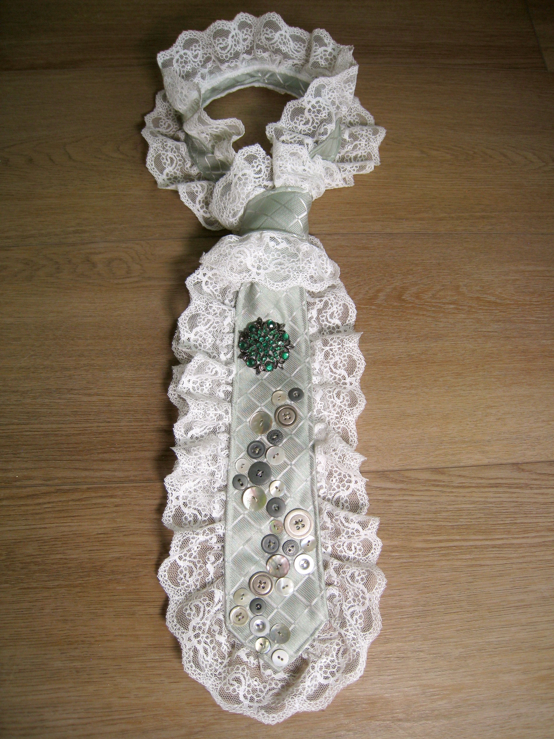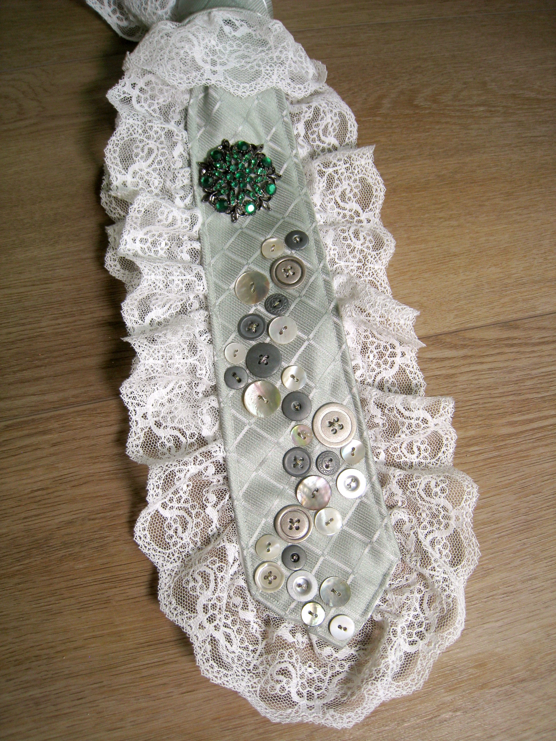 one of a kind upcycled vintage tie featuring hand embellished buttons, rhinestone pin and lace trim.