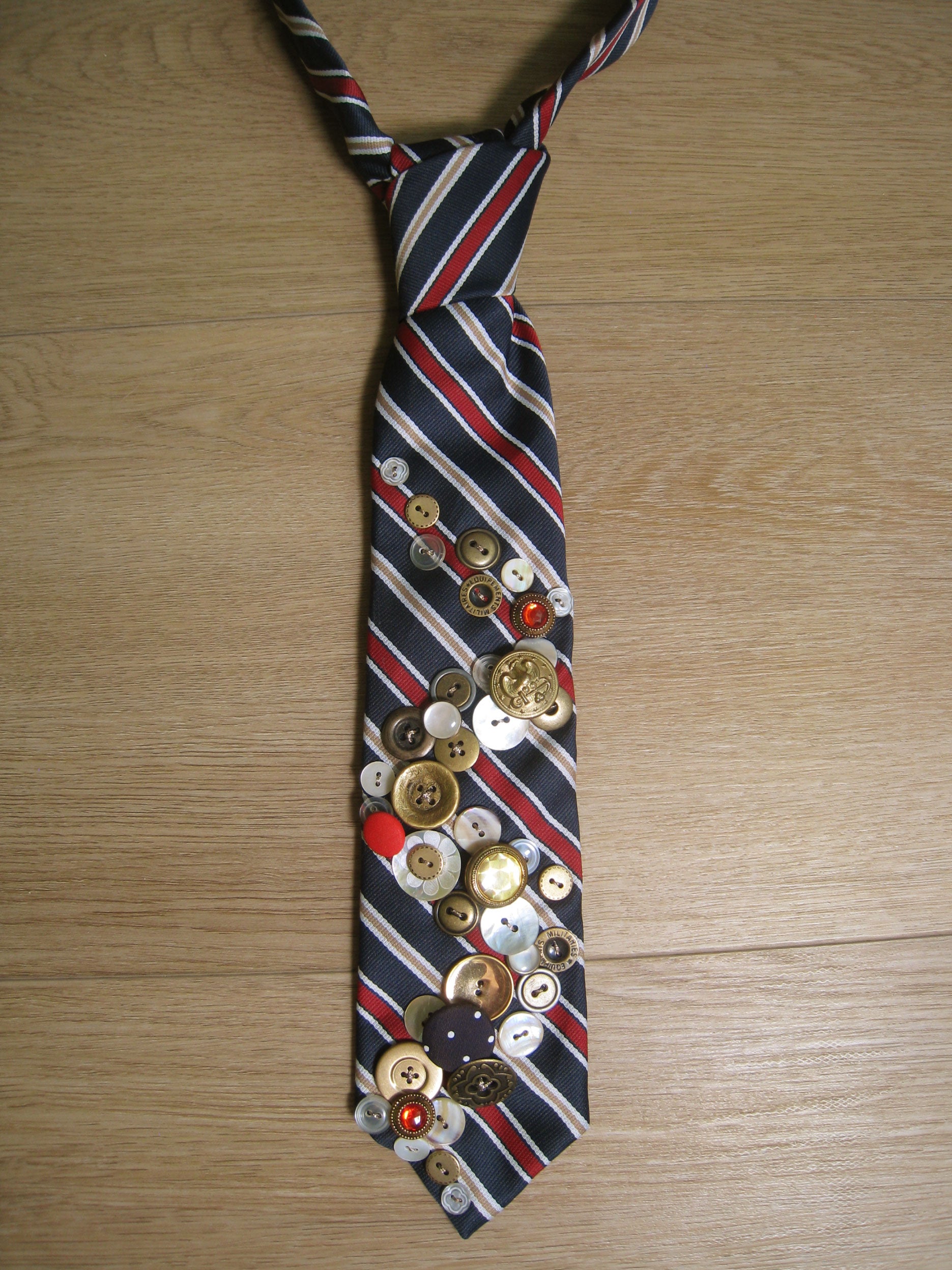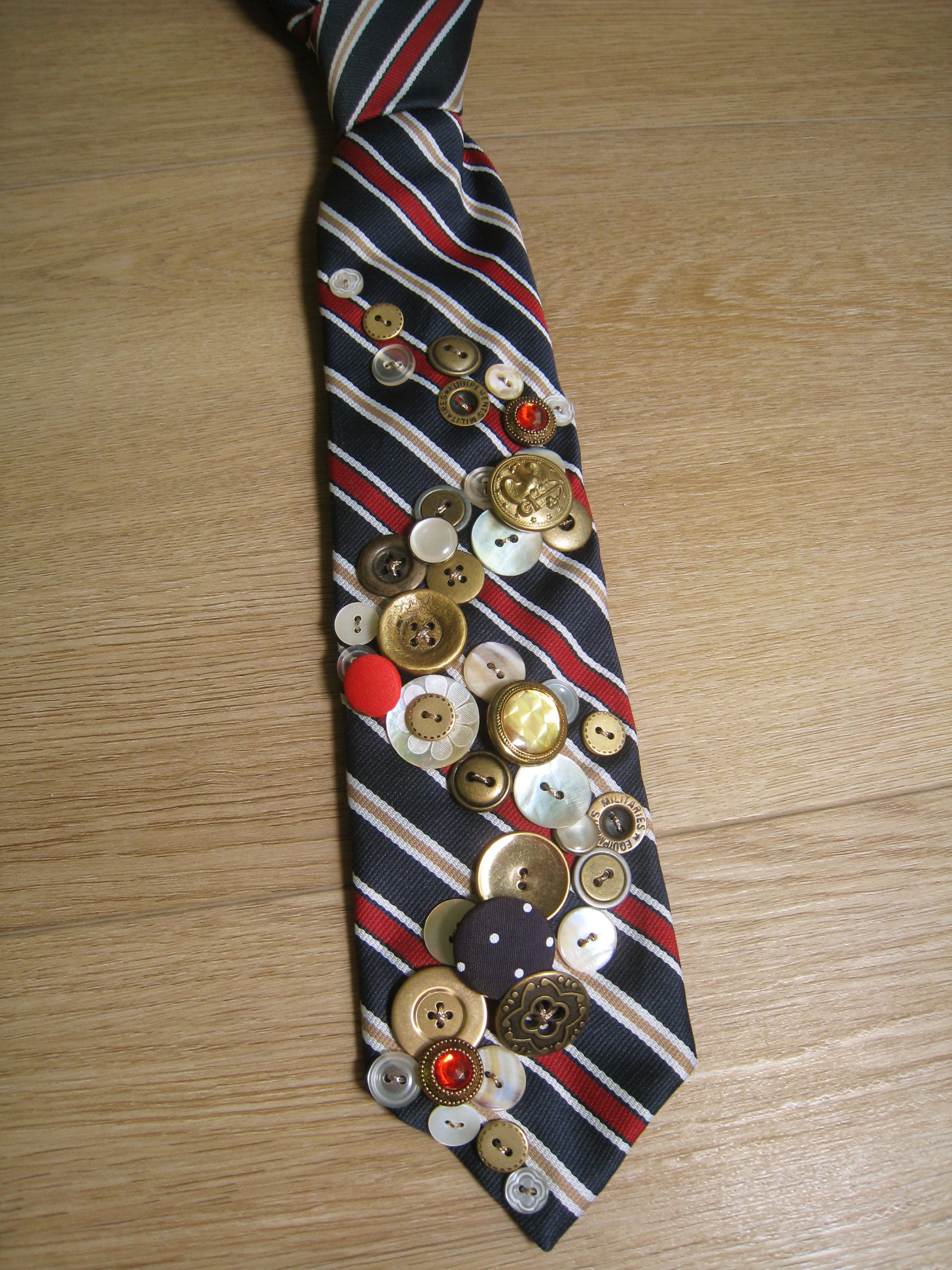 one of a kind upcycled vintage tie featuring hand embellished buttons.