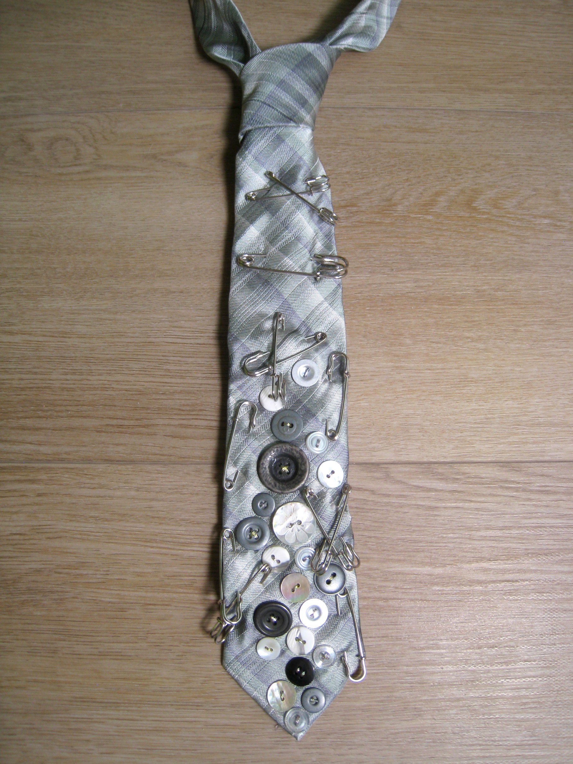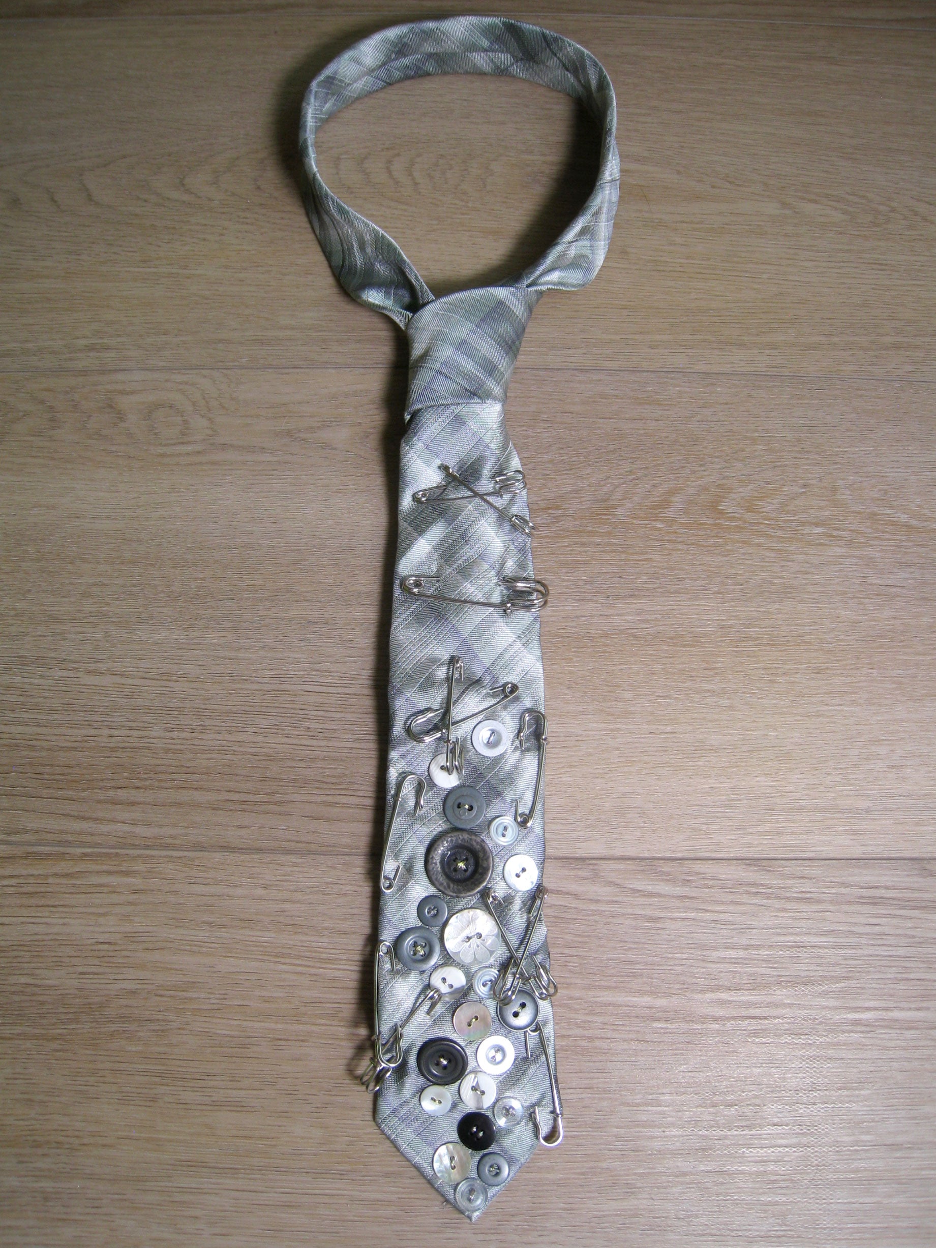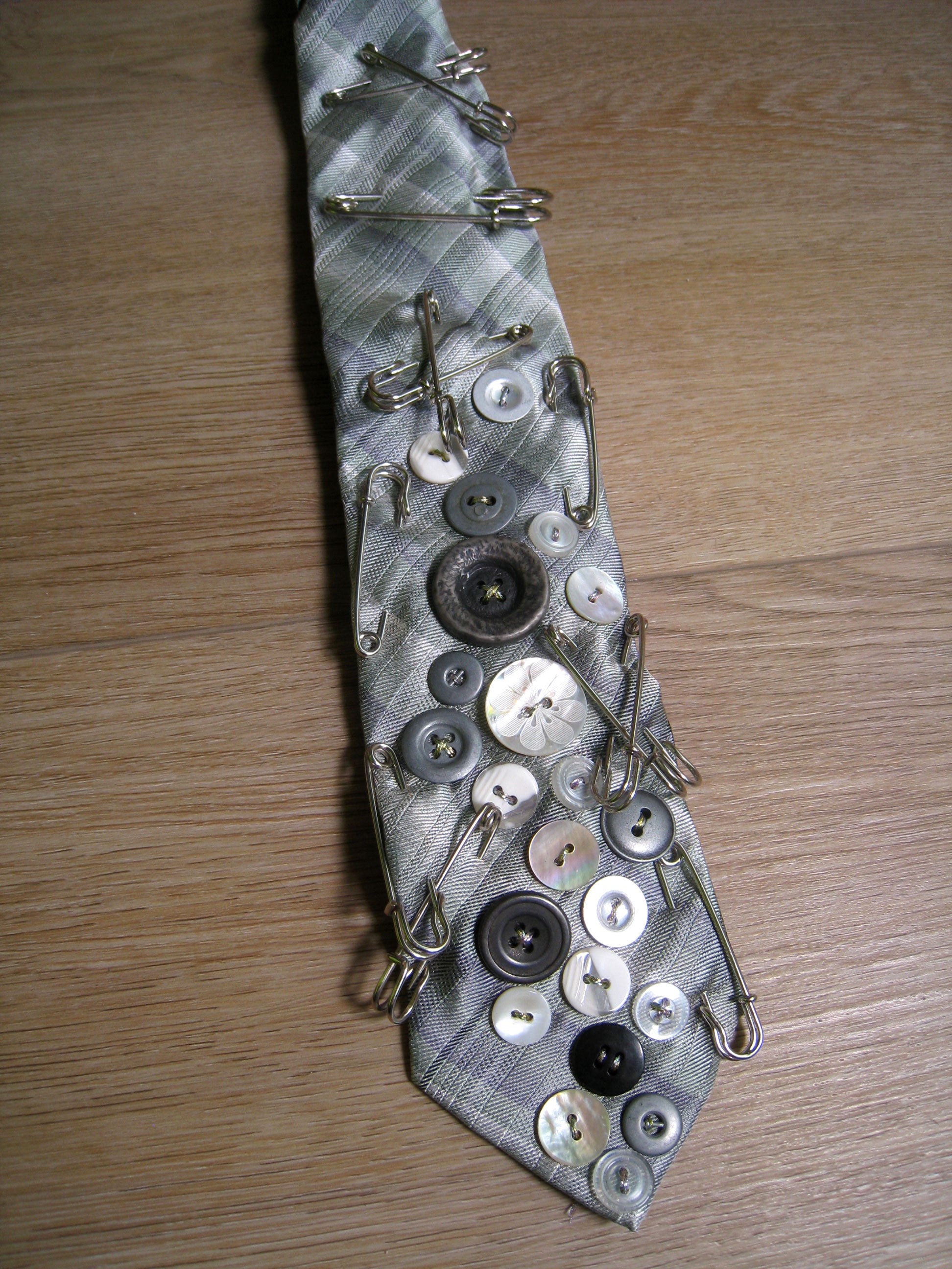 one of a kind upcycled vintage tie featuring hand embellished buttons and safety pins.