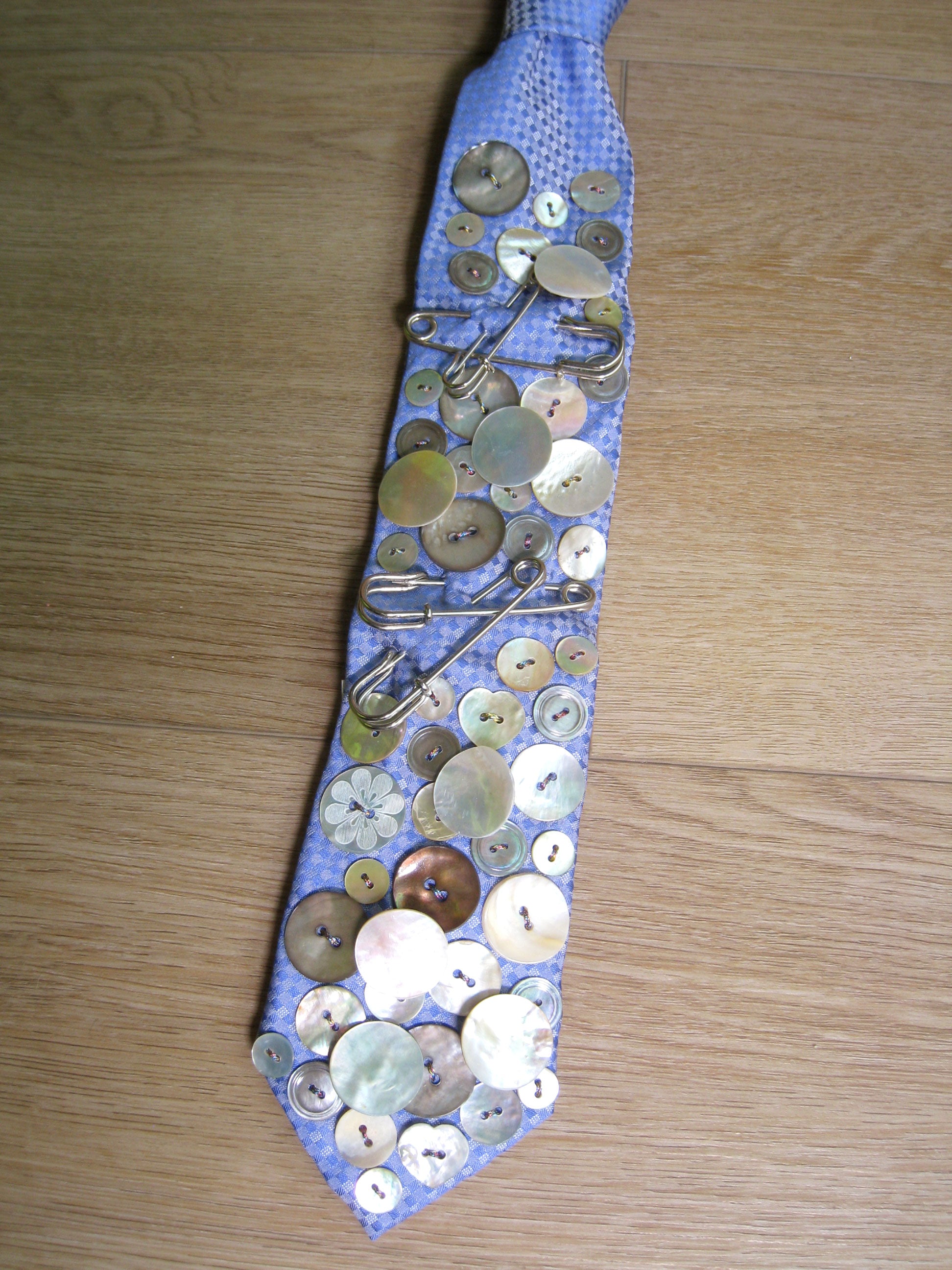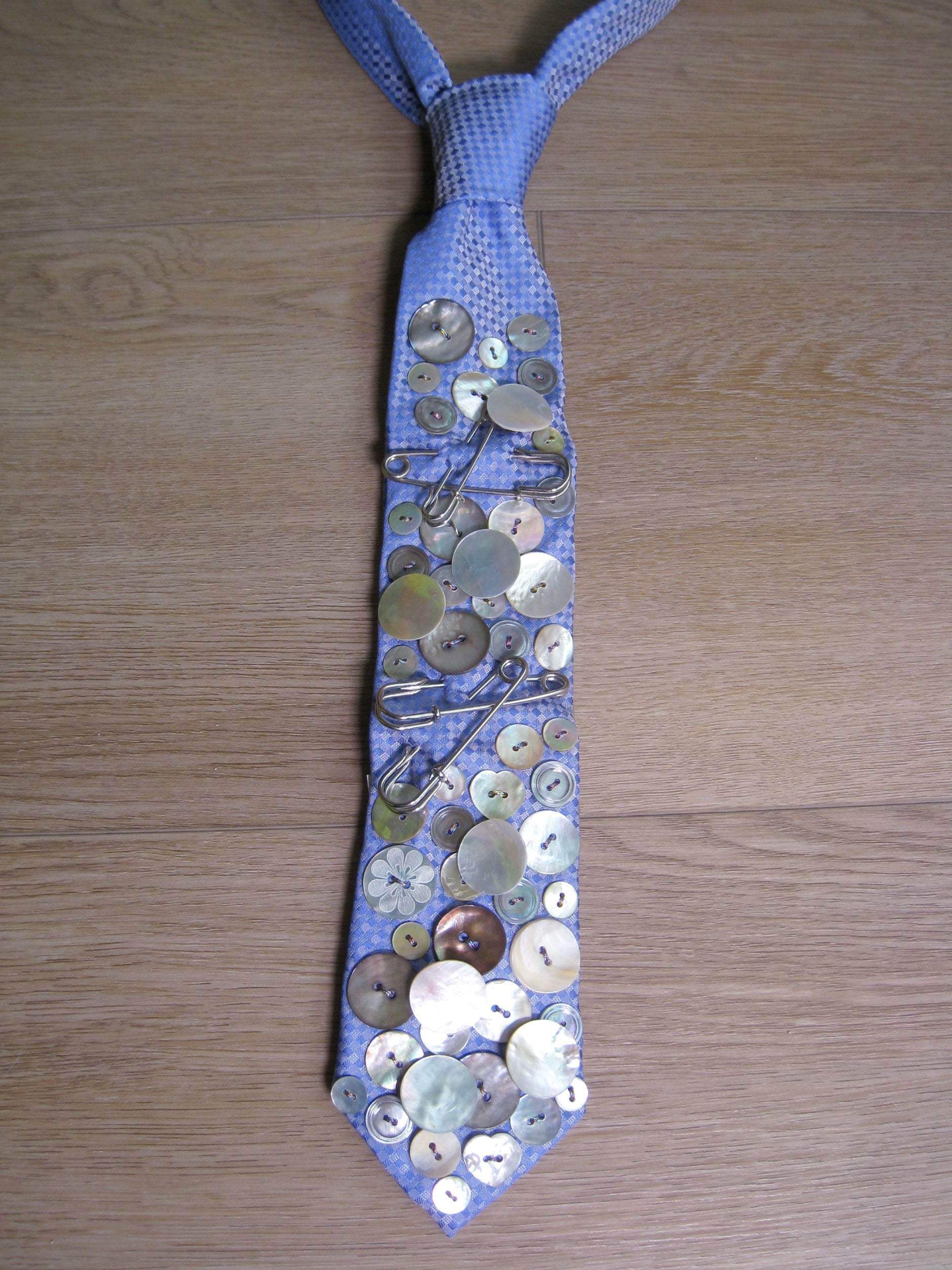 one of a kind upcycled vintage tie featuring hand embellished buttons and safety pins.