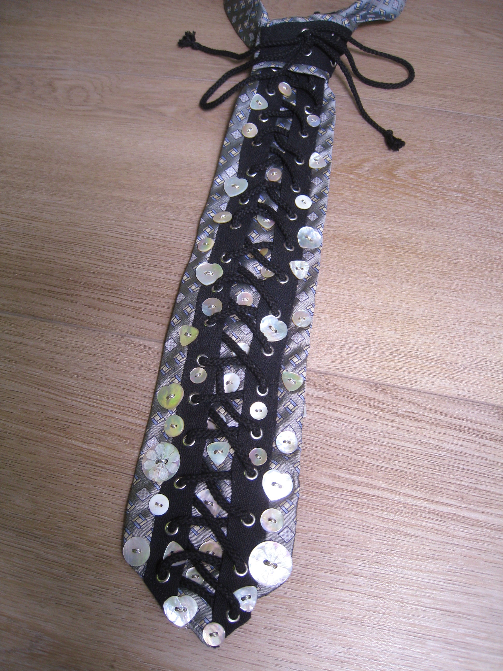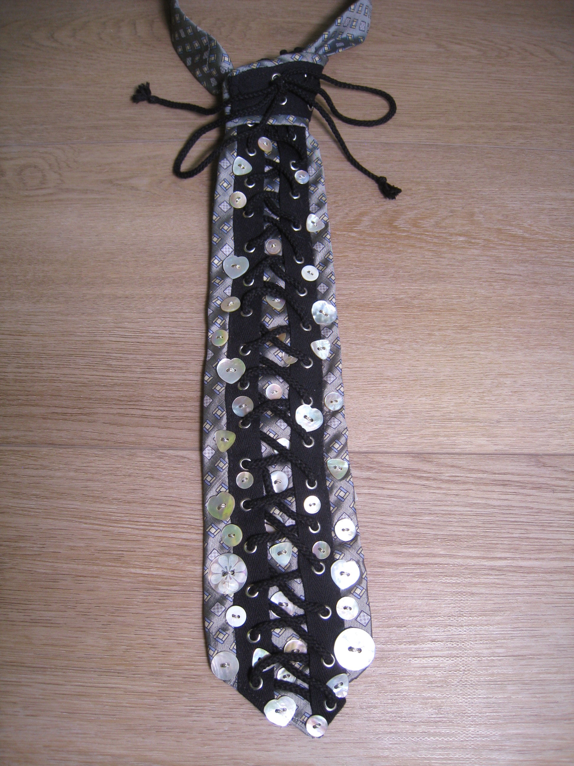 one of a kind upcycled vintage tie featuring hand embellished buttons and lace up detail.